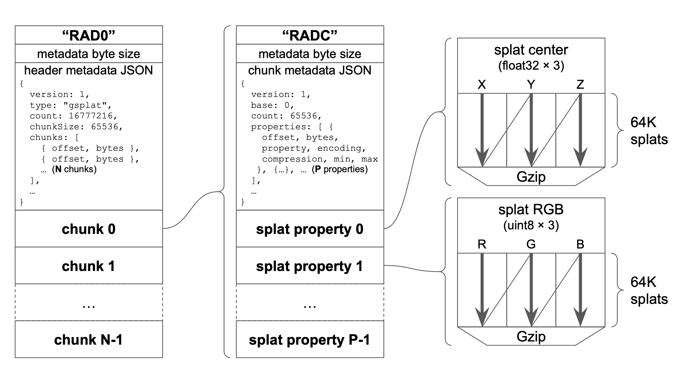 Each chunk itself uses a similar format: a header RADC, the size of the chunk header metadata, the metadata JSON, followed by the compressed data for 64K splats. The splat properties are stored in column-order with customizable encodings specific to each property. Each property is compressed using Gzip, which performs well because similar data types are stored together.